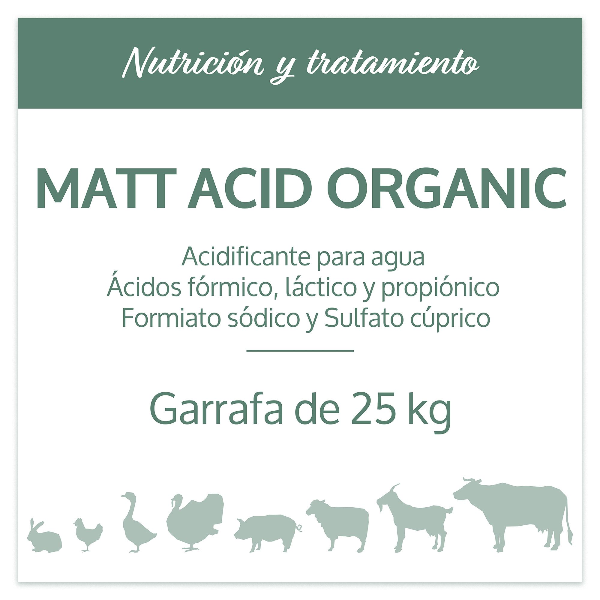 Pienso complementario. Mezcla dé ácidos orgánicos (fórmico, propiónico y láctico), en alta concentración (60%) en proporciones y formulación adecuadas, con un pequeño aporte de cobre. Uso en el agua de bebida (o en el alimento) de los animales de granja. Los ácidos orgánicos son activos nutricionalmente (bajan el pH del estómago, aportan energía y mejoran la digestión, y ayudan al control de procesos digestivos como diarreas o camas húmedas. Además ayudan en la potabilización del agua.